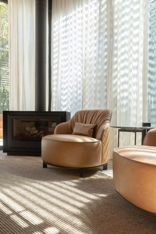 A poltrona Veredas, projetada por Jayme Bernardo e Dieedro, cativa pela delicadeza de suas formas e pelo acabamento drapeado, destacando a sofisticação do couro e a sua singularidade.