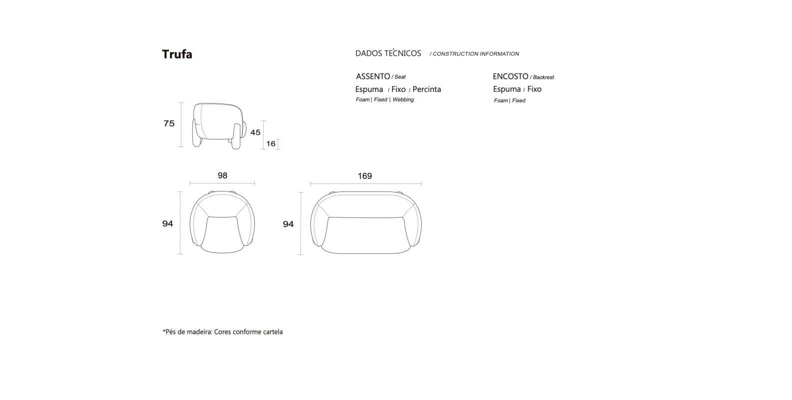 A poltrona Trufa Namoradeira, desenhada por Samuca Gerber, combina robustez e aconchego em uma peça de presença marcante. Suas formas arredondadas e generosas se apoiam sobre pés de madeira volumosos, que evidenciam a matéria-prima brasileira e ancoram visualmente o conjunto com naturalidade. Disponível em duas versões, de um e dois lugares, Trufa amplia as possibilidades de uso, mantendo sempre o caráter descontraído e acolhedor que define seu desenho.