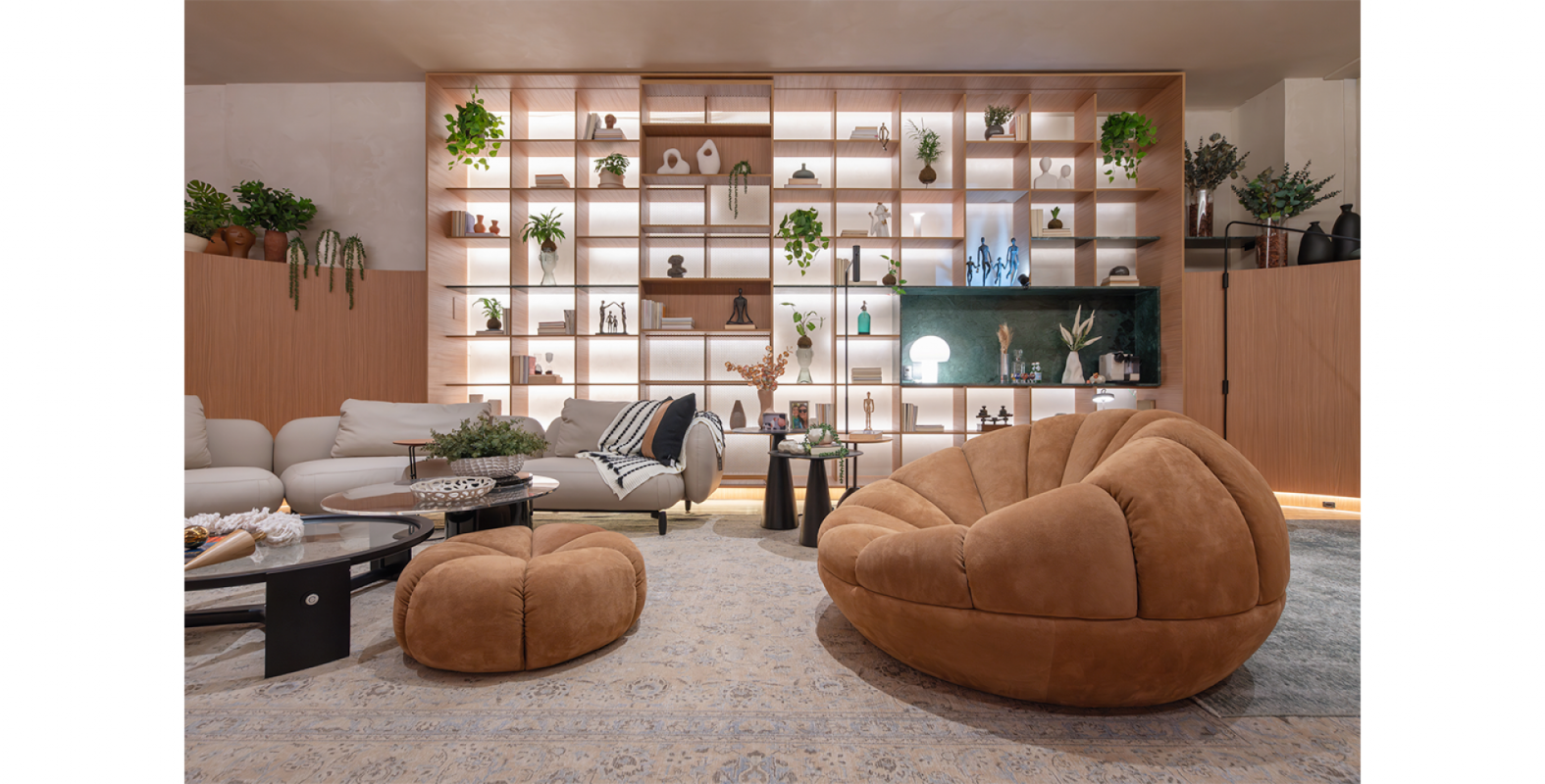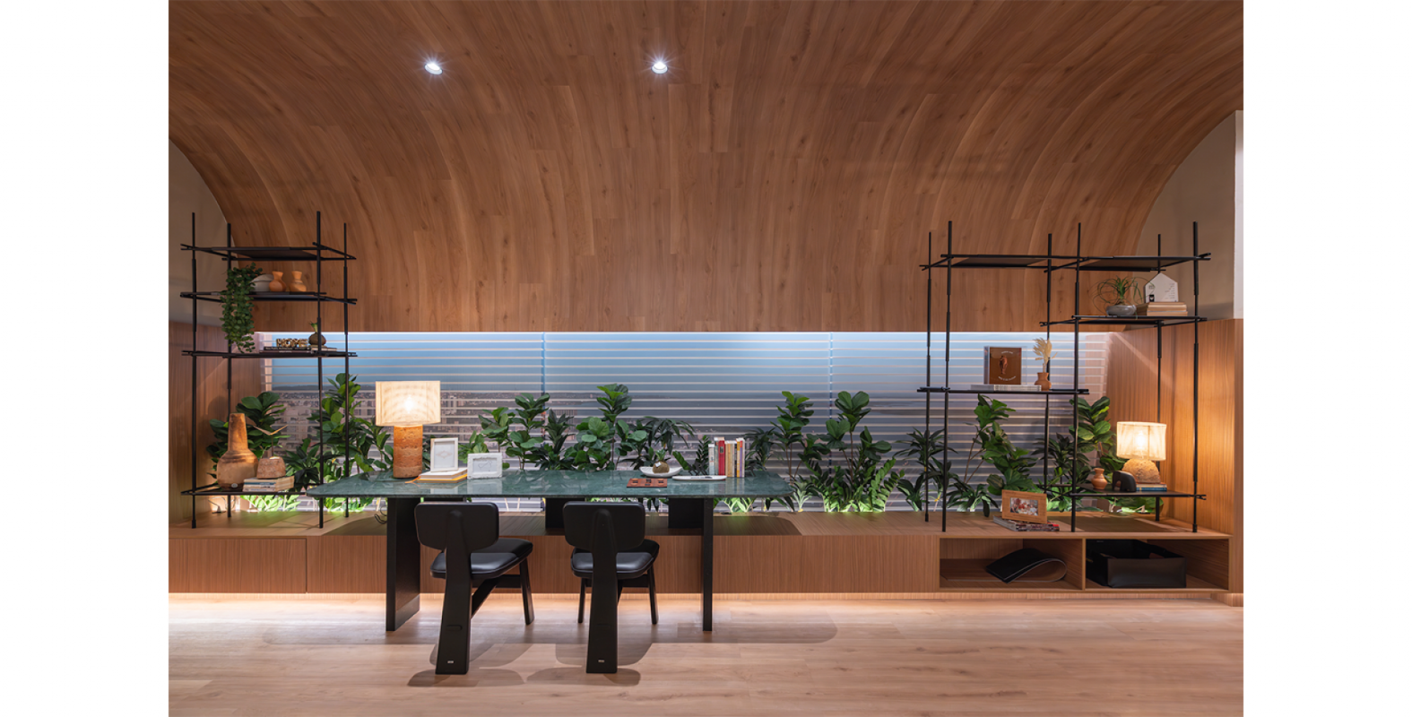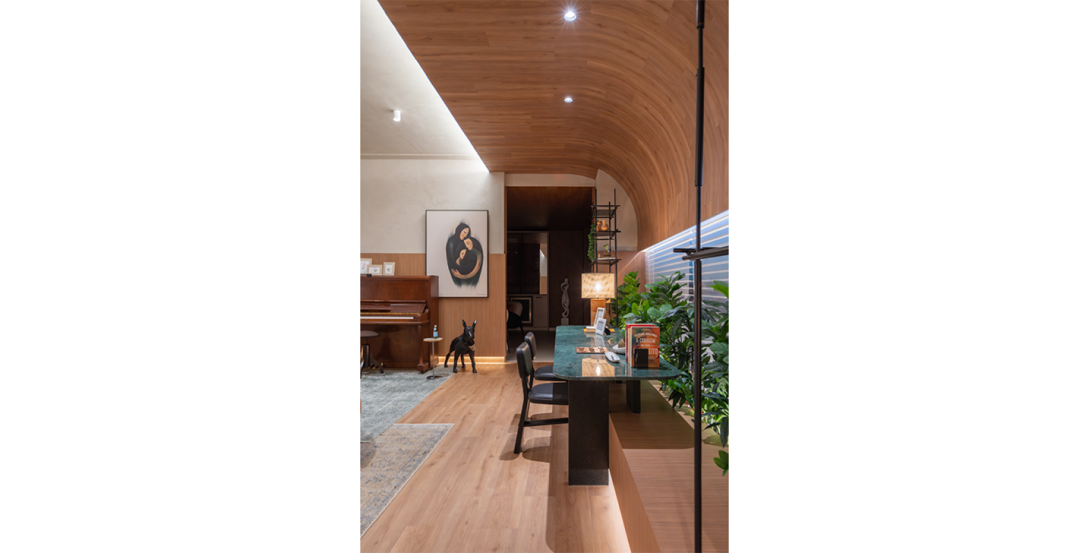 Ali, a Salva compõe a narrativa com o sofá Kalós, de Jayme Bernardo para Dieedro, e com duas criações de Samuca Gerber: a poltrona Bergamota e a cadeira Estandarte. O projeto harmoniza linhas retas e curvas, equilibrando o simétrico e o orgânico. Um detalhe sensível marca a cota da enchente recente nos painéis, convidando à reflexão e à memória.