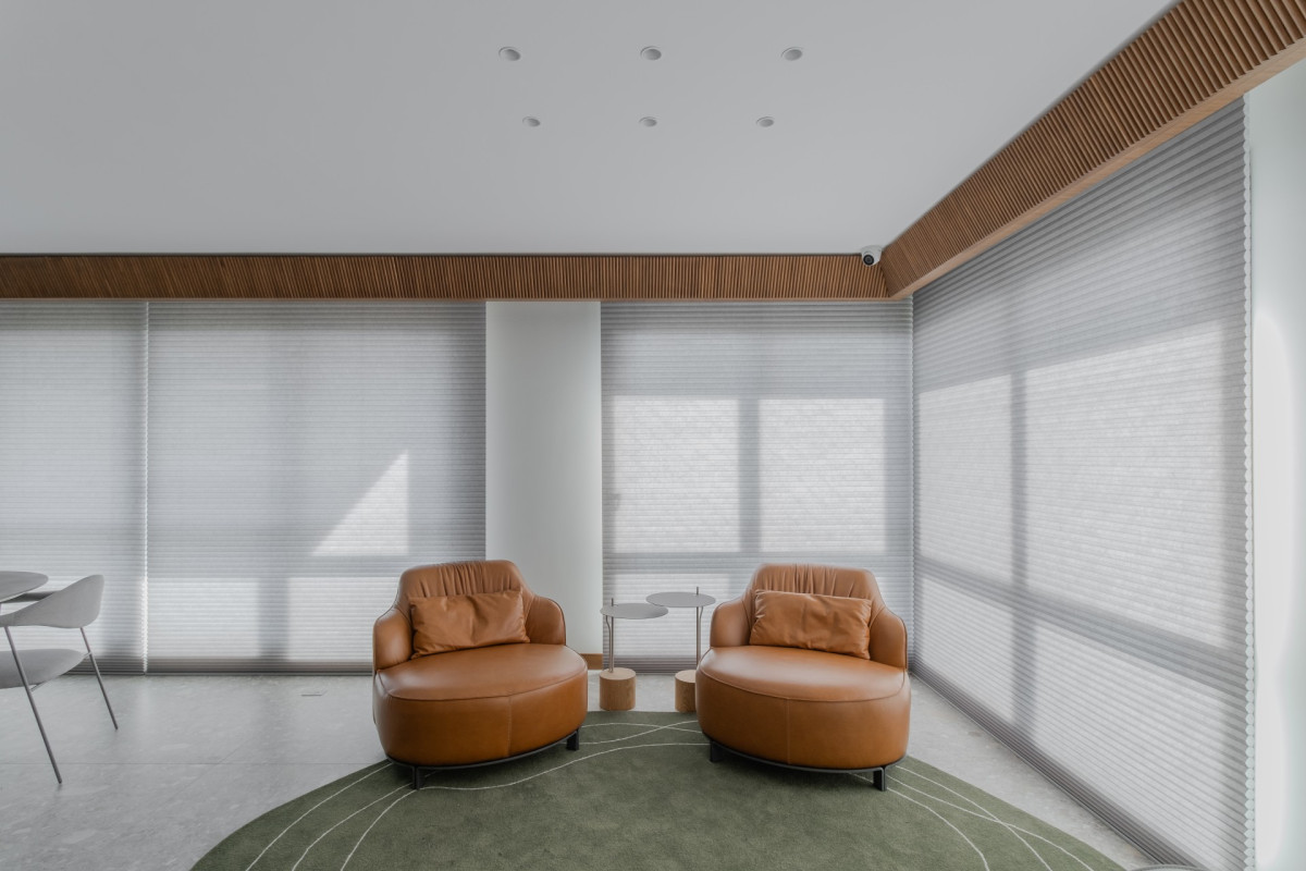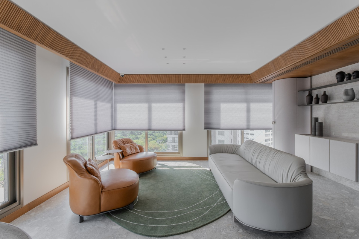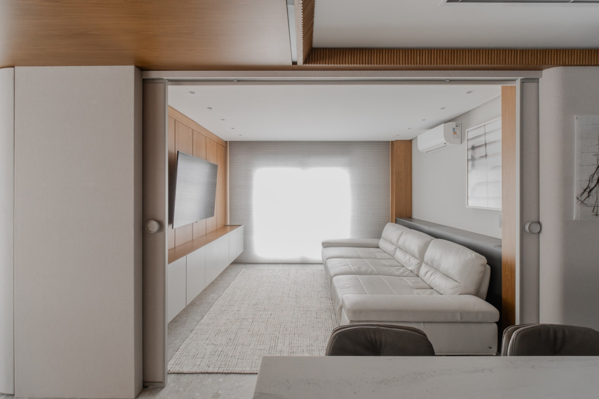 O destaque vai para o design marcante do sofá Linea, assinado pelo escritório, que confere personalidade única ao espaço.