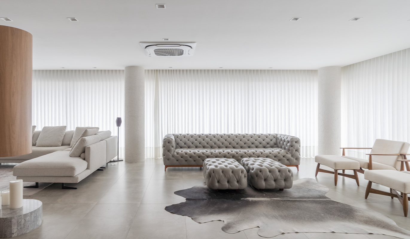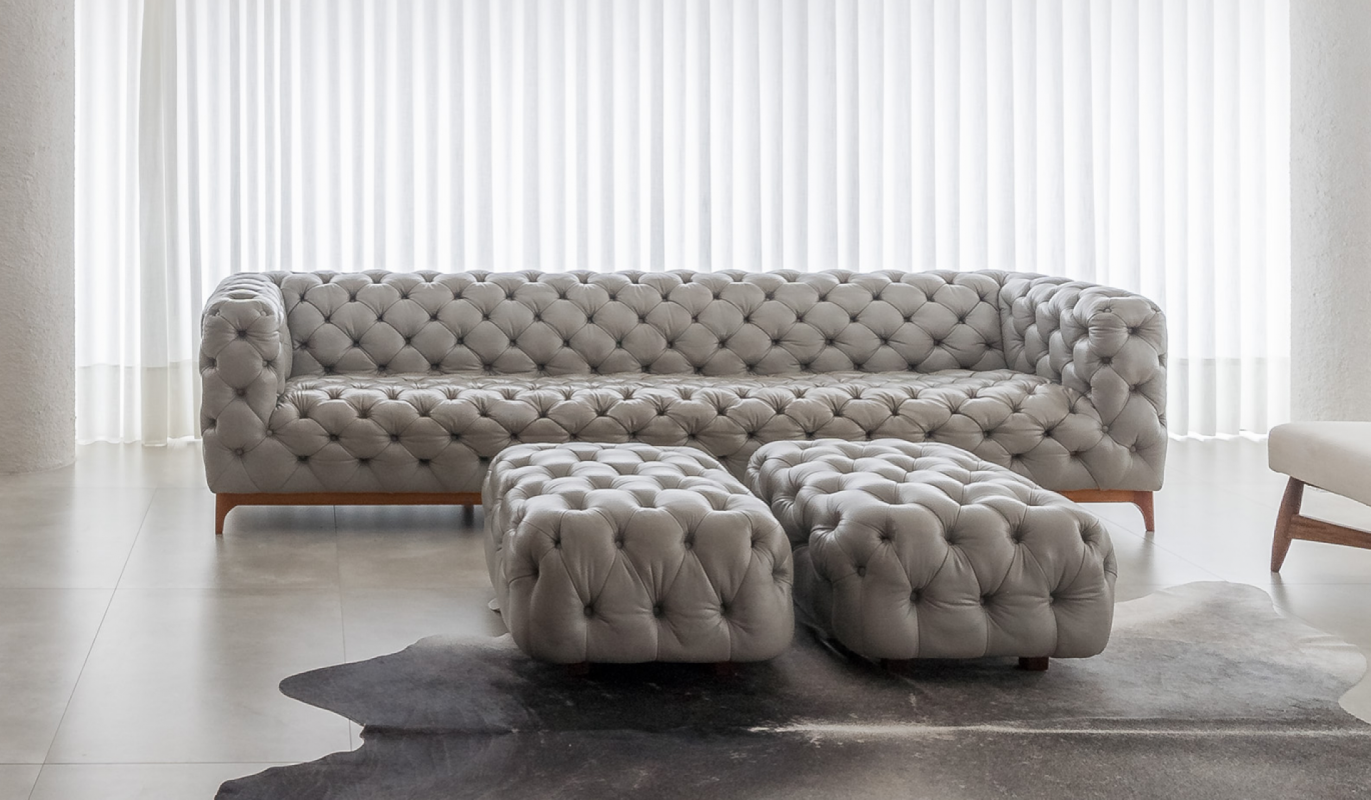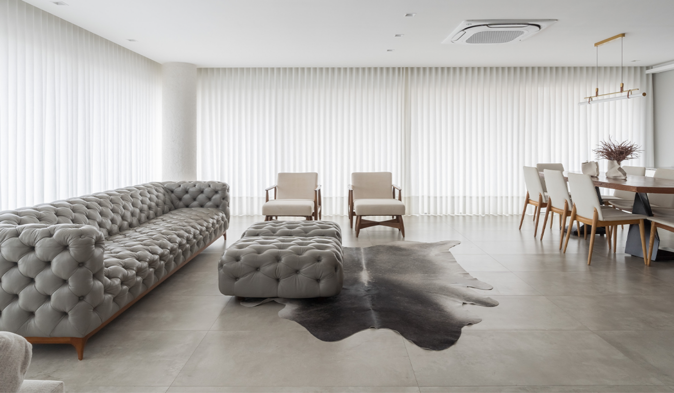A mescla harmônica entre tons de cinza, branco e amadeirado confere uma atmosfera de elegância e serenidade. No coração desse espaço, está o sofá Sólon, com seu charme em matte grey e o toque artesanal do capitonê. Seu design é um elo entre tradição e modernidade. E enquanto este ambiente se desdobra em hall de entrada, sala de visitas e sala de estar, é o sofá Solón que acolhe e ancora toda a experiência, proporcionando robustez, conforto e uma assinatura inconfundível de personalidade.