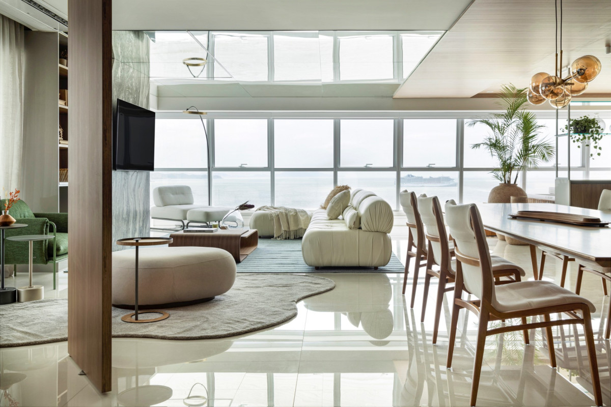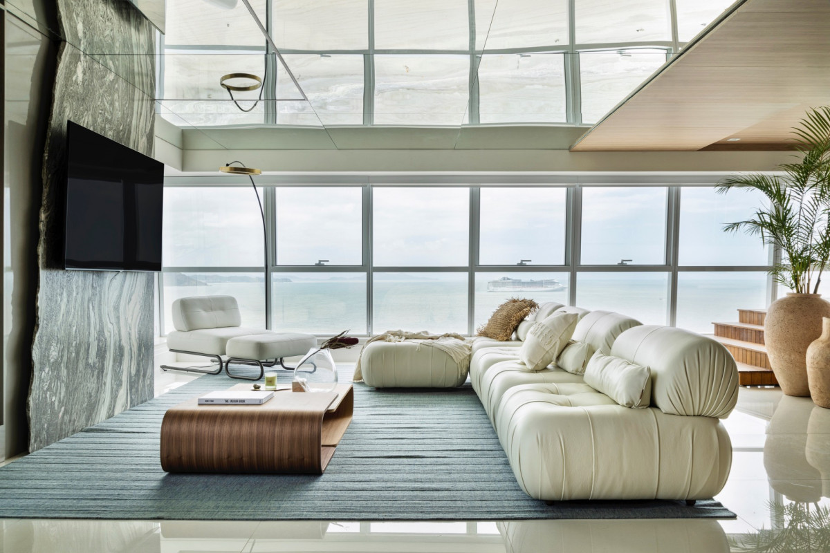 Harmonizando o design com a natureza: o espaço concebido pela arquiteta Natalia Xavier celebra a fusão entre o mundo do design e a exuberância da paisagem litorânea.