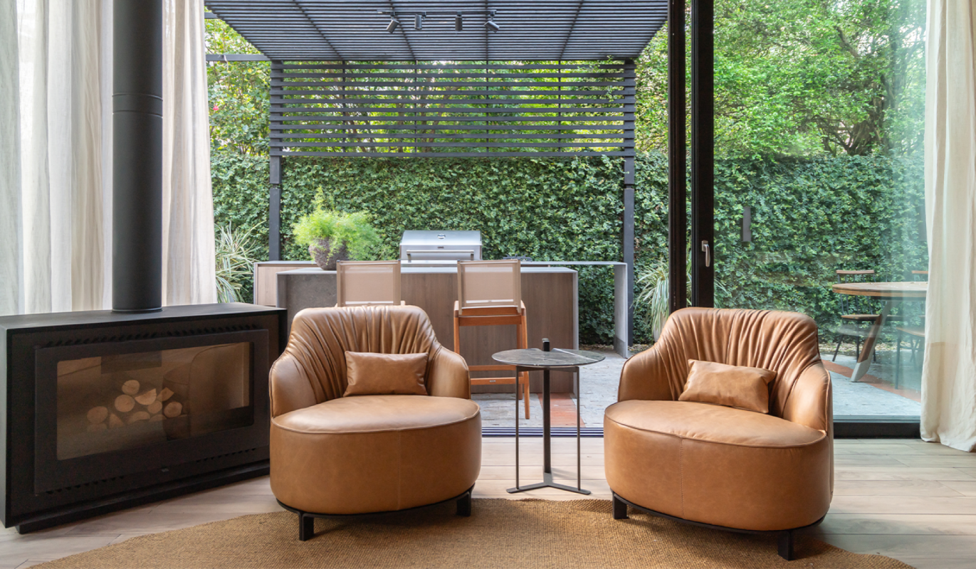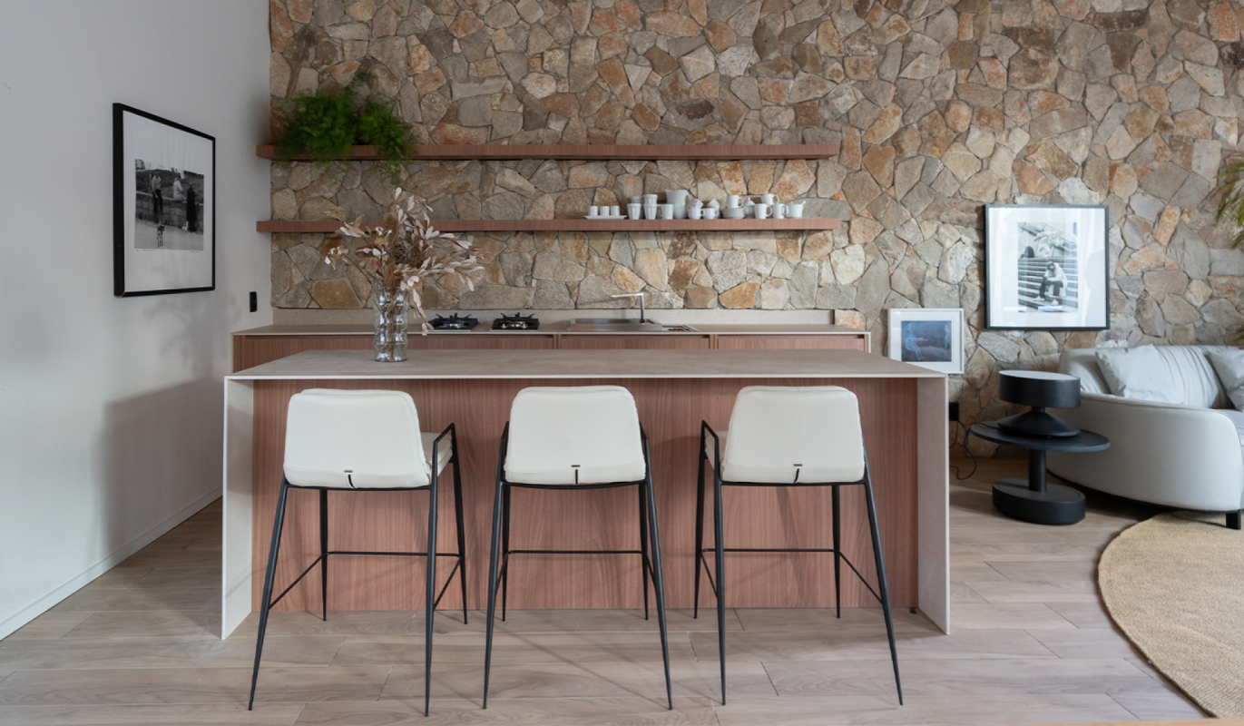 O ambiente incorpora peças de mobiliário da Salva, como o Sofá Veredas Curvo, as Poltronas Veredas Small e as Banquetas Seriemas, para criar um ambiente que integra elementos de design orgânico e funcionalidade.