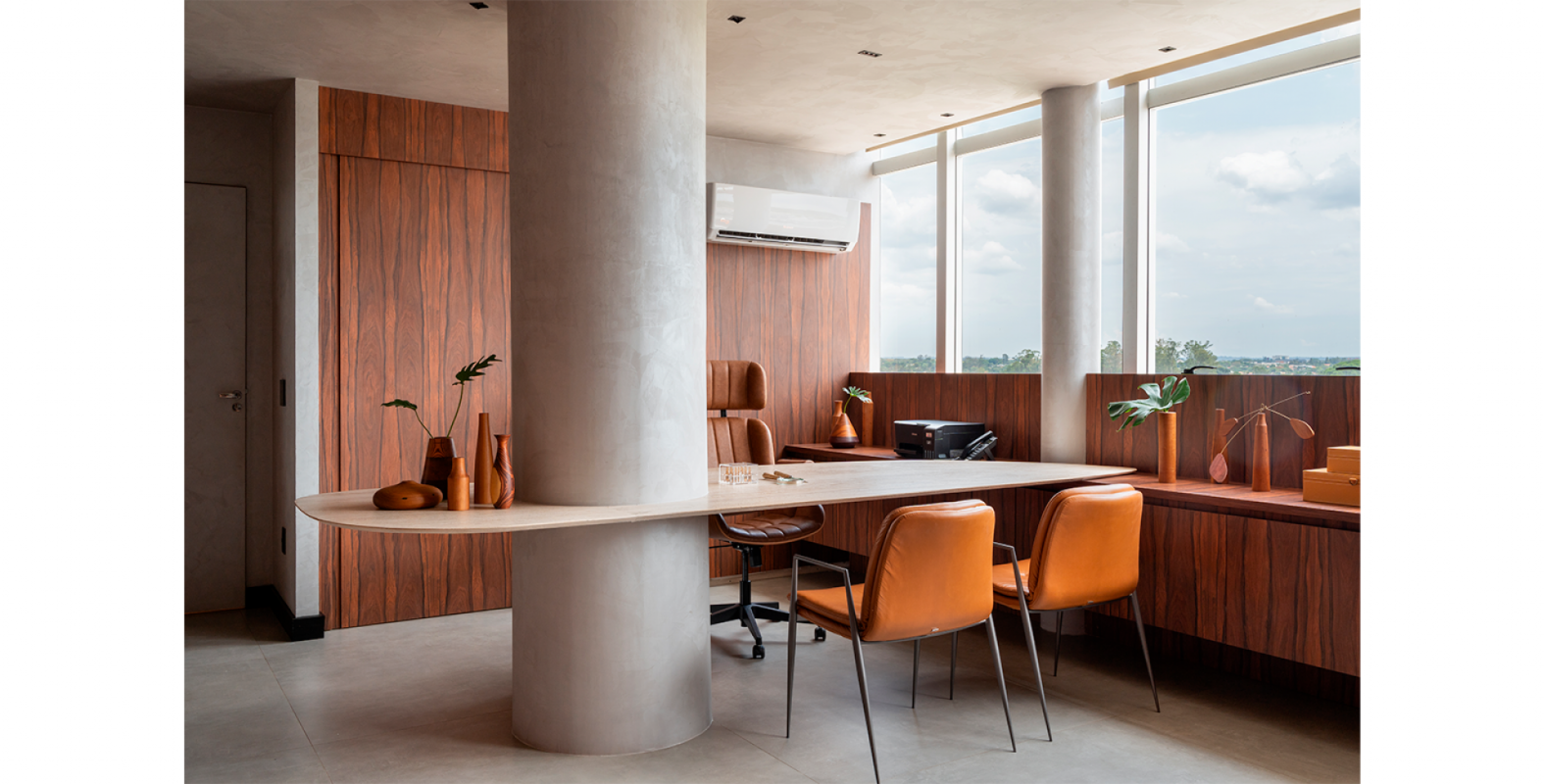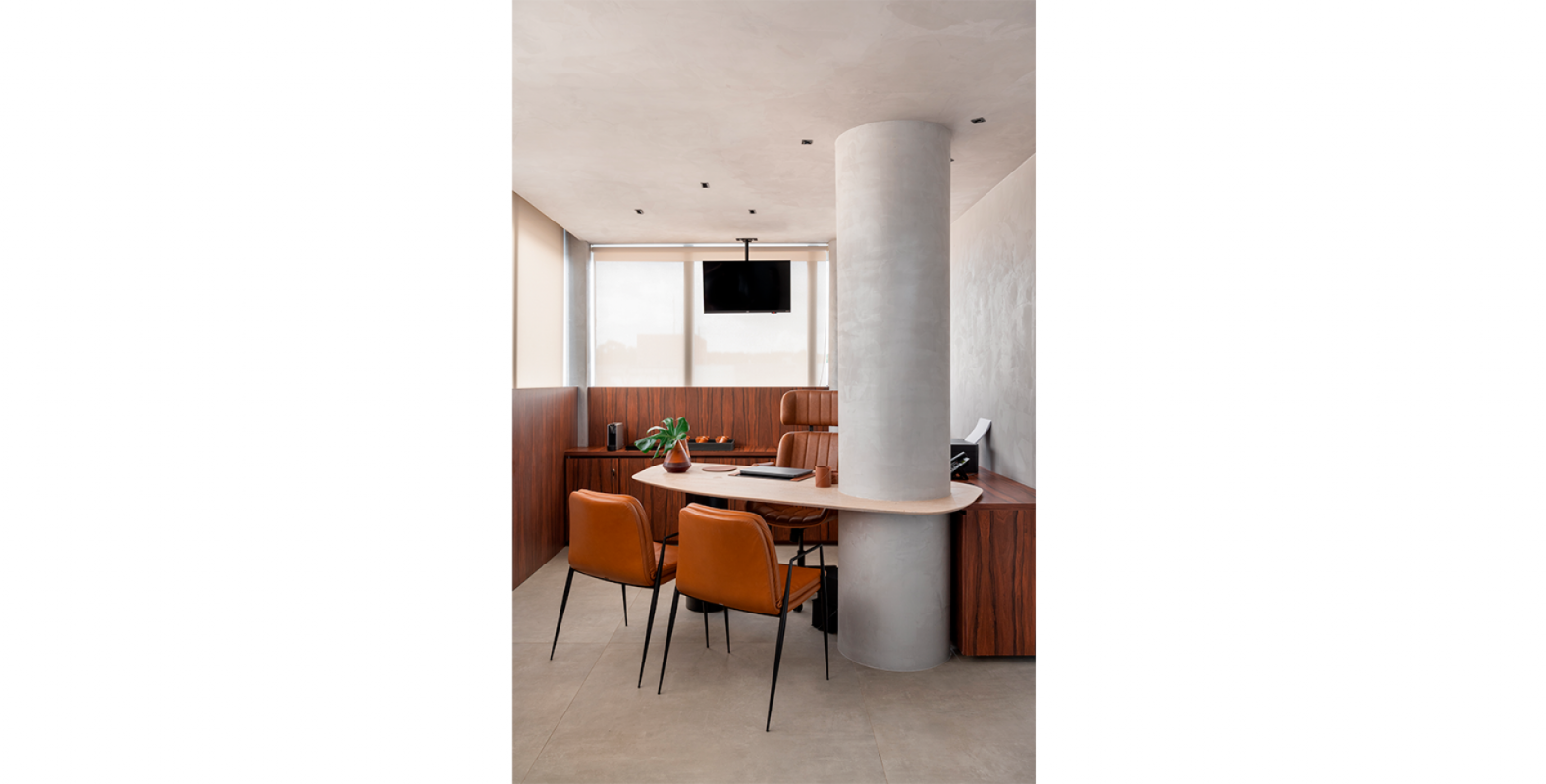 O protagonismo fica a cargo do pé de oliveira posicionada estrategicamente no jardim de inverno que traz a iluminação natural para o interior da clínica. Aliado ao uso da vegetação, a escolha das cores em tons terrosos e as linhas orgânicas dos mobiliários , remetem à natureza oferecendo uma sensação de fluidez e movimento , criando um ambiente acolhedor e convidativo.