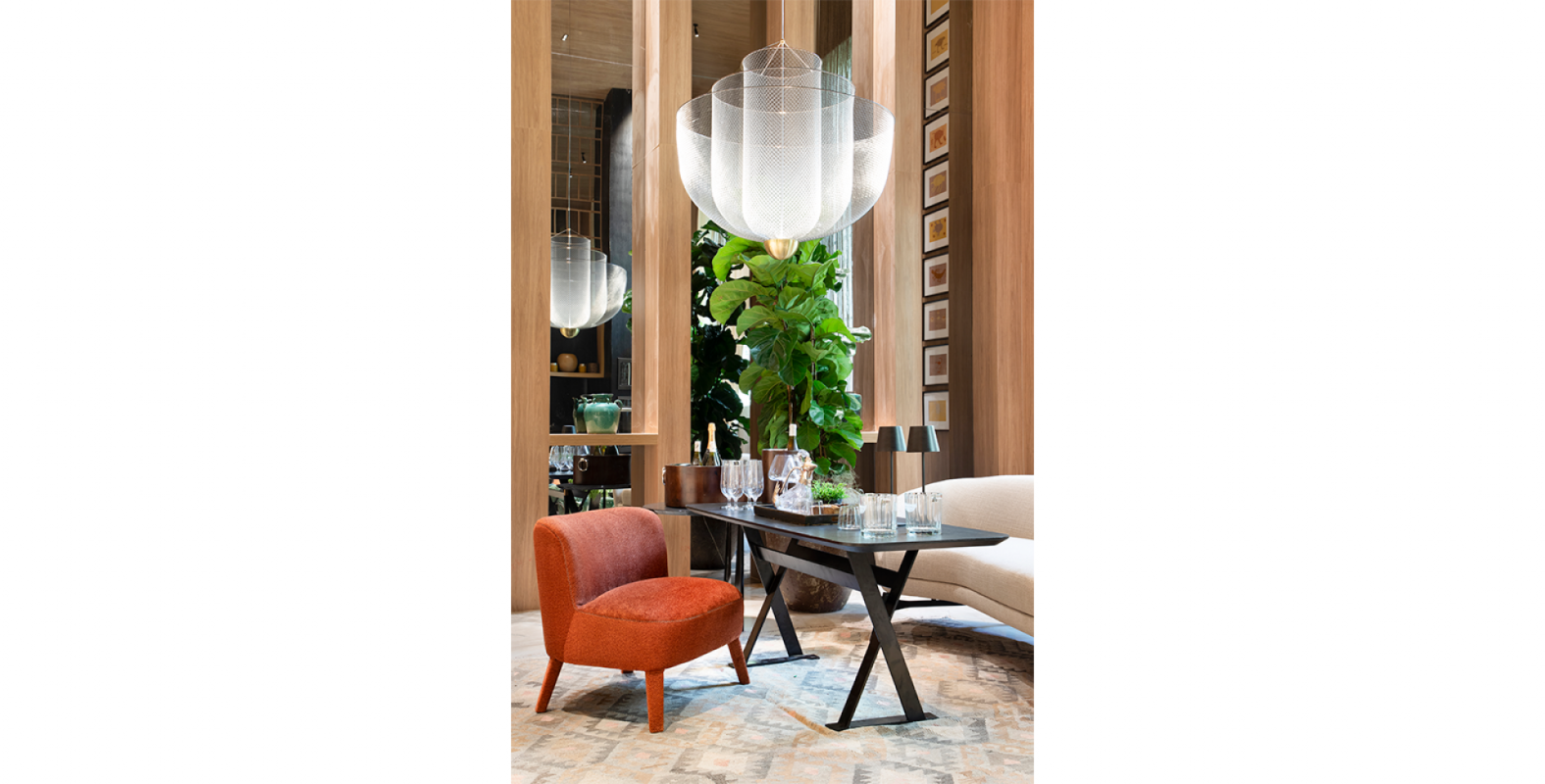 Na área do bar, surge um espaço mais intimista: a composição com um sofá compacto e as Poltronas Cajá é uma releitura afetiva de uma viagem da arquiteta a Veneza. As formas curvas e a escala acolhedora evocam o clima das salas de estar venezianas, pensadas para a convivência. Com seu design orgânico e toque contemporâneo, as Cajá reforçam a proposta de um morar sensorial, onde cada detalhe carrega intenção.