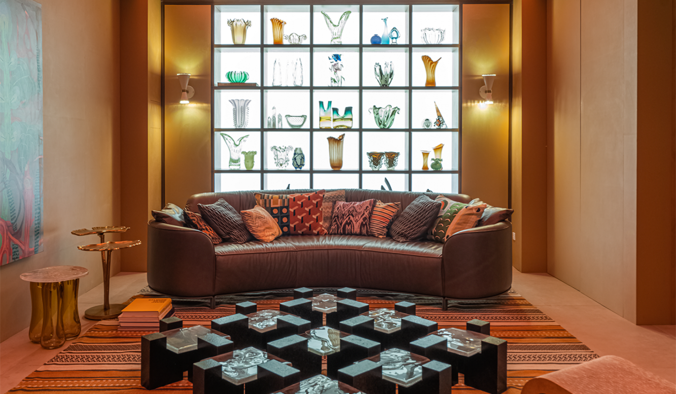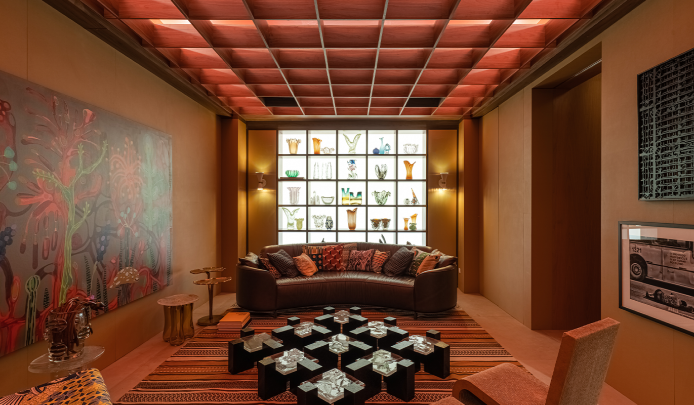Cores, texturas e formas se unem harmoniosamente, criando uma atmosfera única. Destaque no espaço, o sofá Veredas, de Dieedro by Jayme Bernardo, possui linhas curvas que dialogam perfeitamente com a proposta do ambiente. A mistura de materiais cuidadosamente selecionados, aliada ao uso abundante de obras de arte, reflete a assinatura "A Sense of Place" dos dois escritórios. A cultura e a história servem de inspiração para todos os momentos vividos neste espaço.