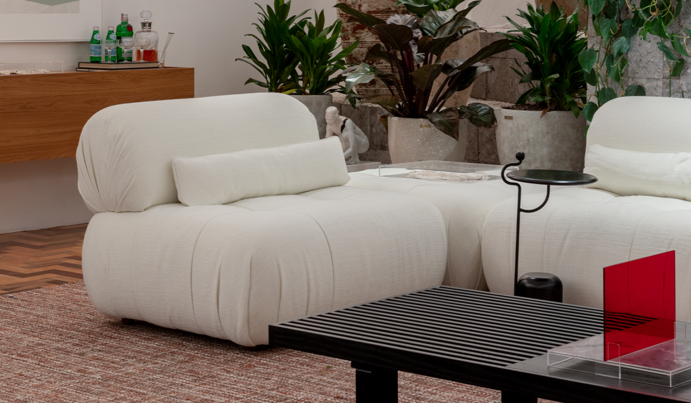 As formas arredondadas do sofá Igarapé destacam-se, harmonizando-se perfeitamente com a essência do ambiente sofisticado e acolhedor.