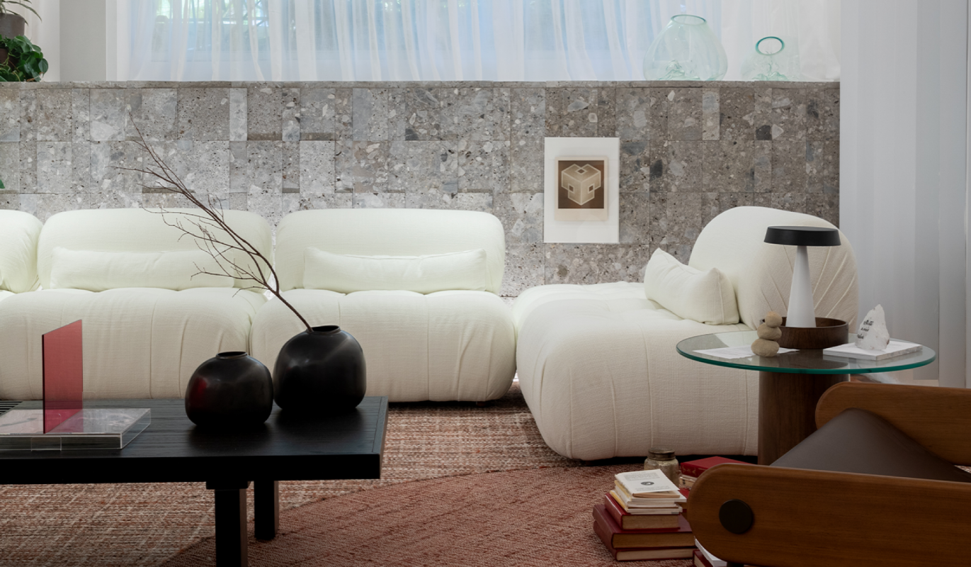 Um mergulho ao essencial no living de 94 m² da arquiteta Bruna Sposito, onde a conexão, presença e acolhimento se entrelaçam.