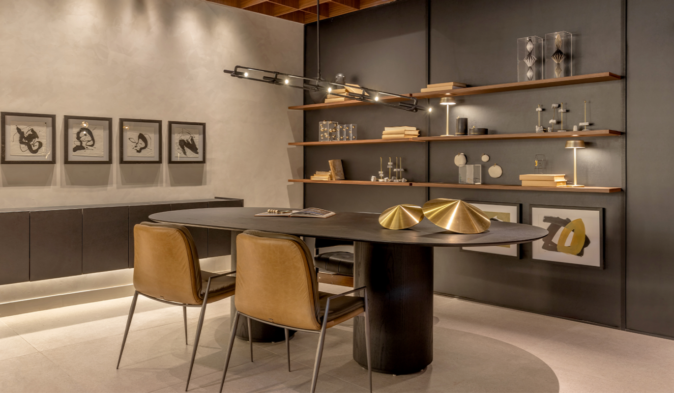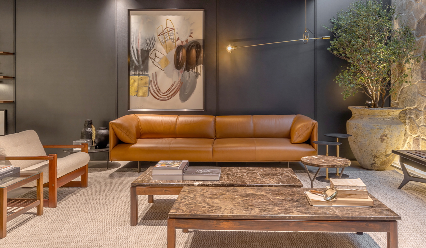 O sofá Burton é um destaque no ambiente. Seu design contemporâneo convida ao relaxamento, sendo uma peça-chave que combina conforto e estética. As cadeiras Seriema, desenhadas por Samuca Gerber, por outro lado, exalam elegância e sofisticação. Juntas, estas peças representam a harmoniosa fusão da tradição brasileira com inovações contemporâneas.