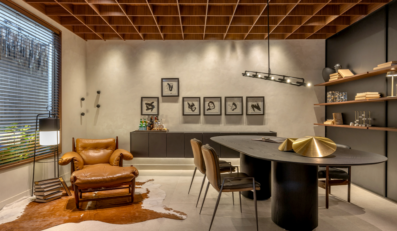 Mergulhando profundamente nas raízes do design brasileiro, o espaço combina tradição e modernidade através de elementos como o teto em muxarabi de madeira e uma paleta de cores sofisticadas. Este ambiente evoca uma sensação de tranquilidade, ao mesmo tempo que celebra a rica história do design nacional.
