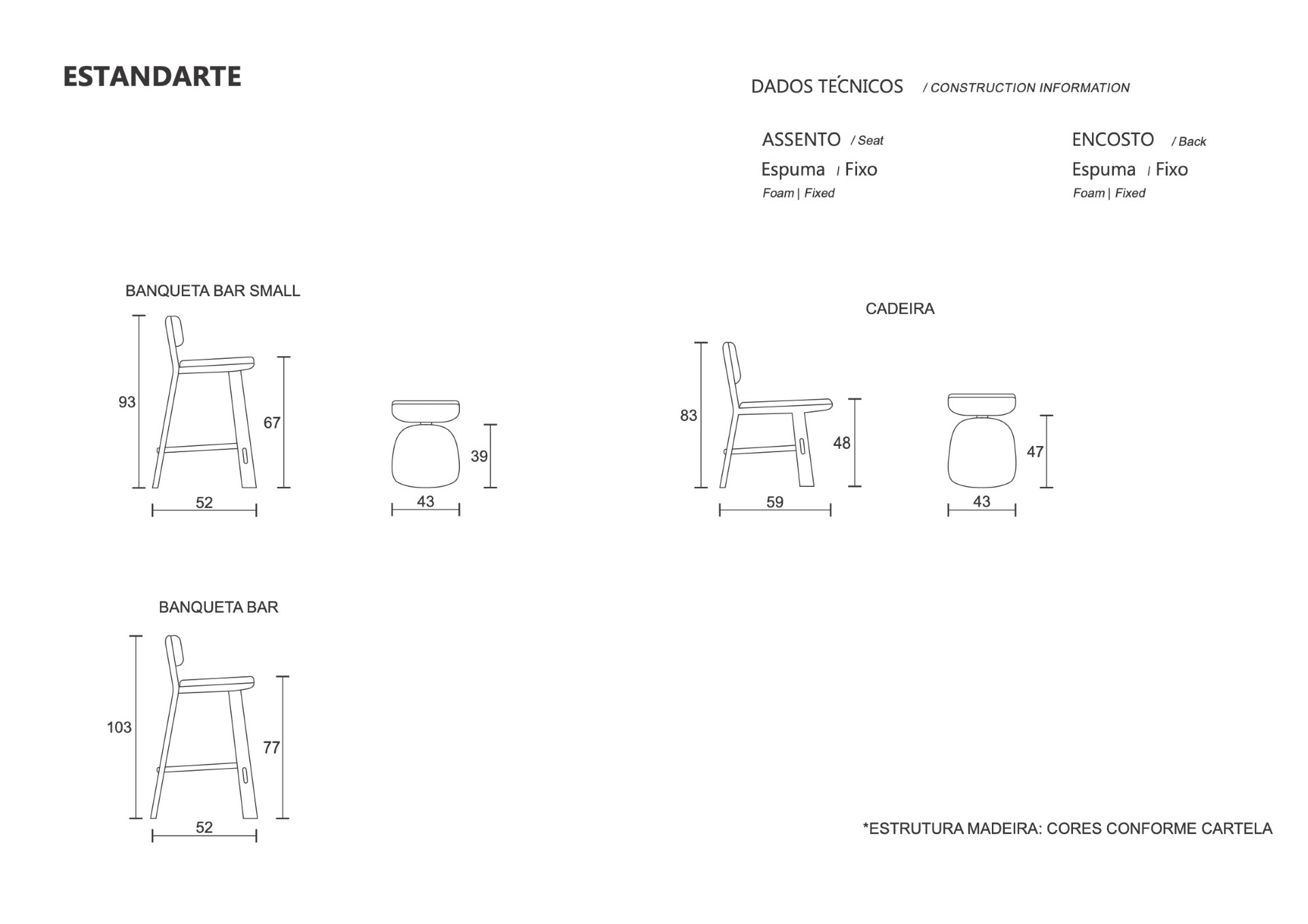 A baqueta Estandarte, por Samuca Gerber, representa o diálogo entre o tradicional e o moderno, com a madeira como protagonista reinterpretada em formas atemporais e atuais. O couro, no encosto e no assento, pode se harmonizar com a madeira em composições monocromáticas ou contrastantes