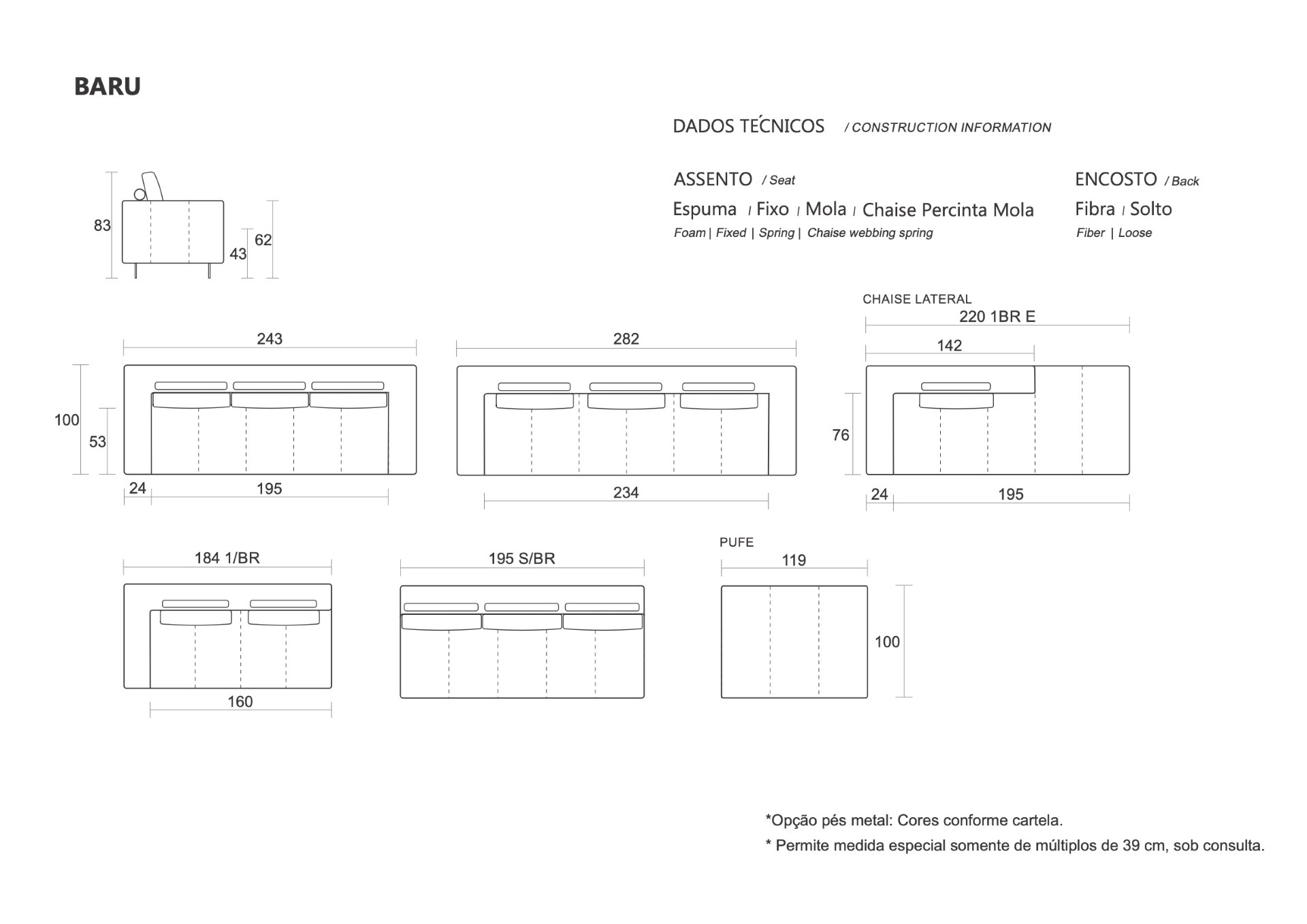 O Sofá Baru se destaca pela leveza visual e versatilidade. Modular, oferece diversas configurações que se adaptam a diferentes ambientes. A opção com pufe amplia as possibilidades, permitindo que a peça se molde às necessidades de uso de cada momento.