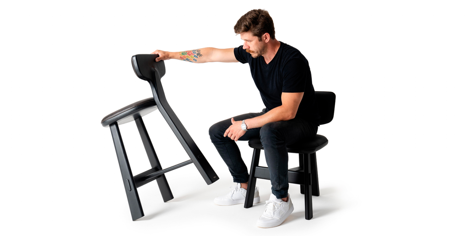 A cadeira Estandarte, por Samuca Gerber, representa o diálogo entre o tradicional e o moderno, com a madeira como protagonista reinterpretada em formas atemporais e atuais. O couro, no encosto e no assento, pode se harmonizar com a madeira em composições monocromáticas ou contrastantes.