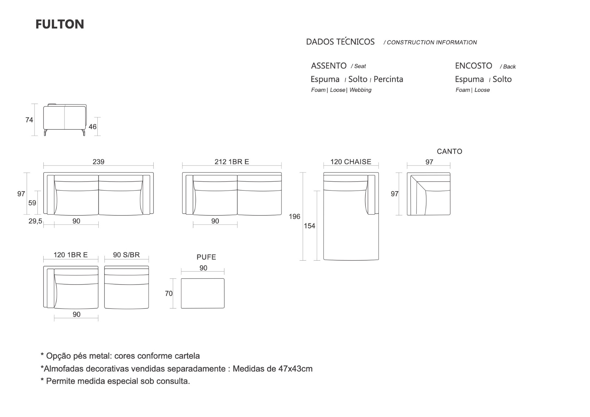 O Sofá Fulton vai além do convencional com sua elegância contemporânea. As almofadas soltas oferecem conforto flexível, enquanto o design robusto e os pés elevados criam uma sensação de leveza. Perfeito para projetos que buscam equilibrar modernidade, sofisticação e conforto.