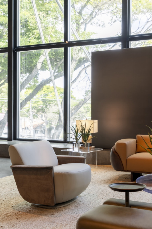 A base da poltrona, robusta e com leves curvas, representa a solidez dos arranha-céus de São Paulo. A estrutura de aço, nos braços da peça, trazem o minimalismo e a modernidade, fazendo referência ao caráter progressista da cidade, que está sempre em constante transformação.