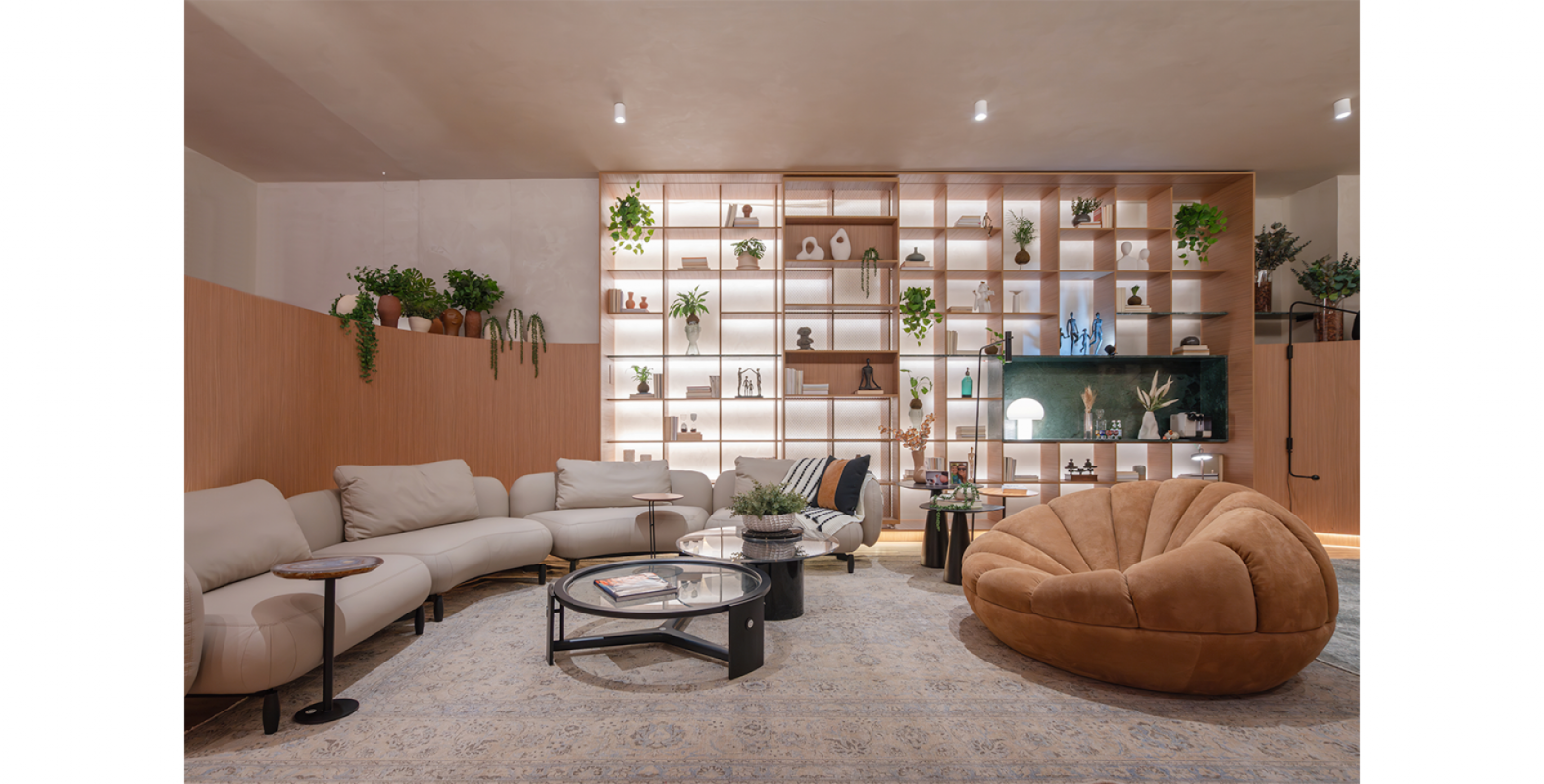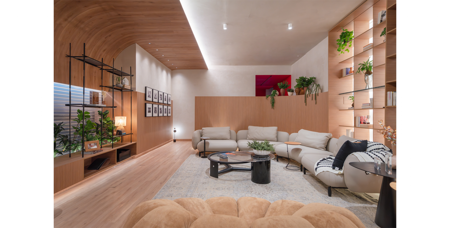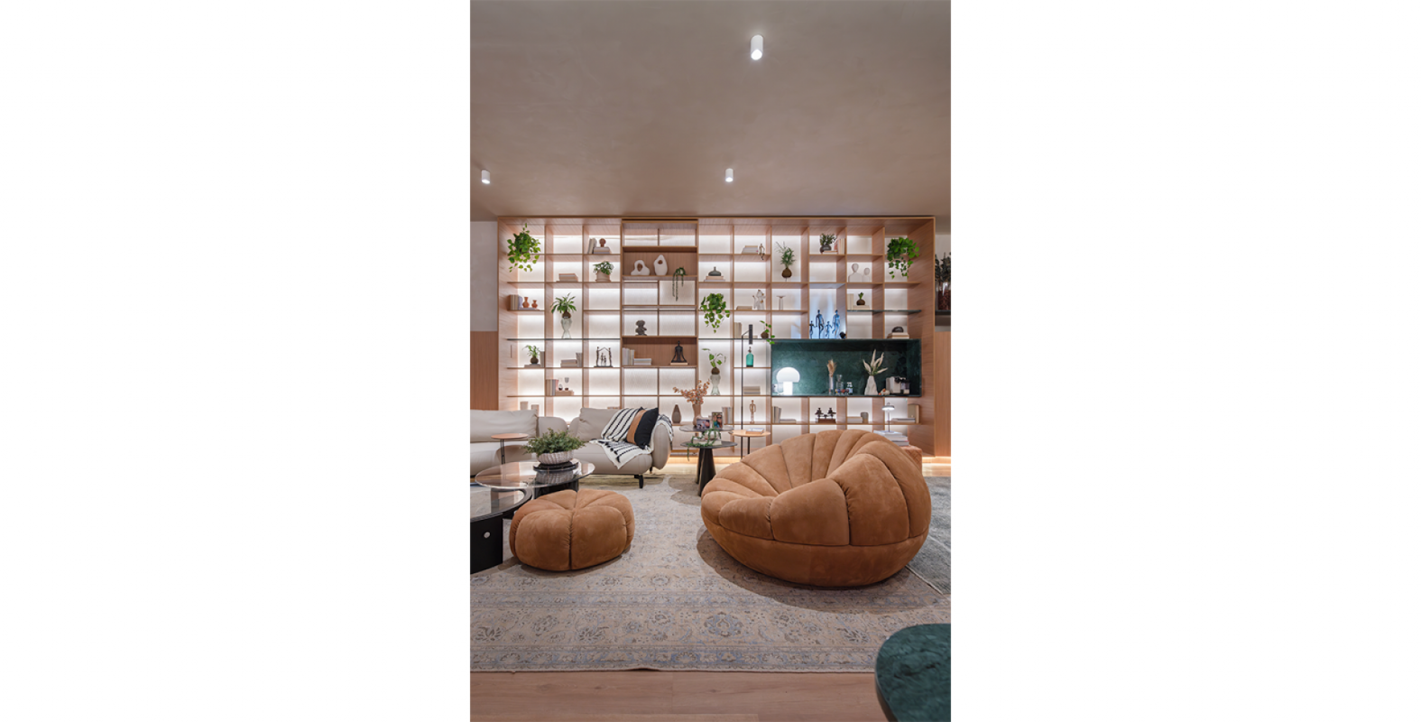 Ali, a Salva compõe a narrativa com o sofá Kalós, de Jayme Bernardo para Dieedro, e com duas criações de Samuca Gerber: a poltrona Bergamota e a cadeira Estandarte. O projeto harmoniza linhas retas e curvas, equilibrando o simétrico e o orgânico. Um detalhe sensível marca a cota da enchente recente nos painéis, convidando à reflexão e à memória.