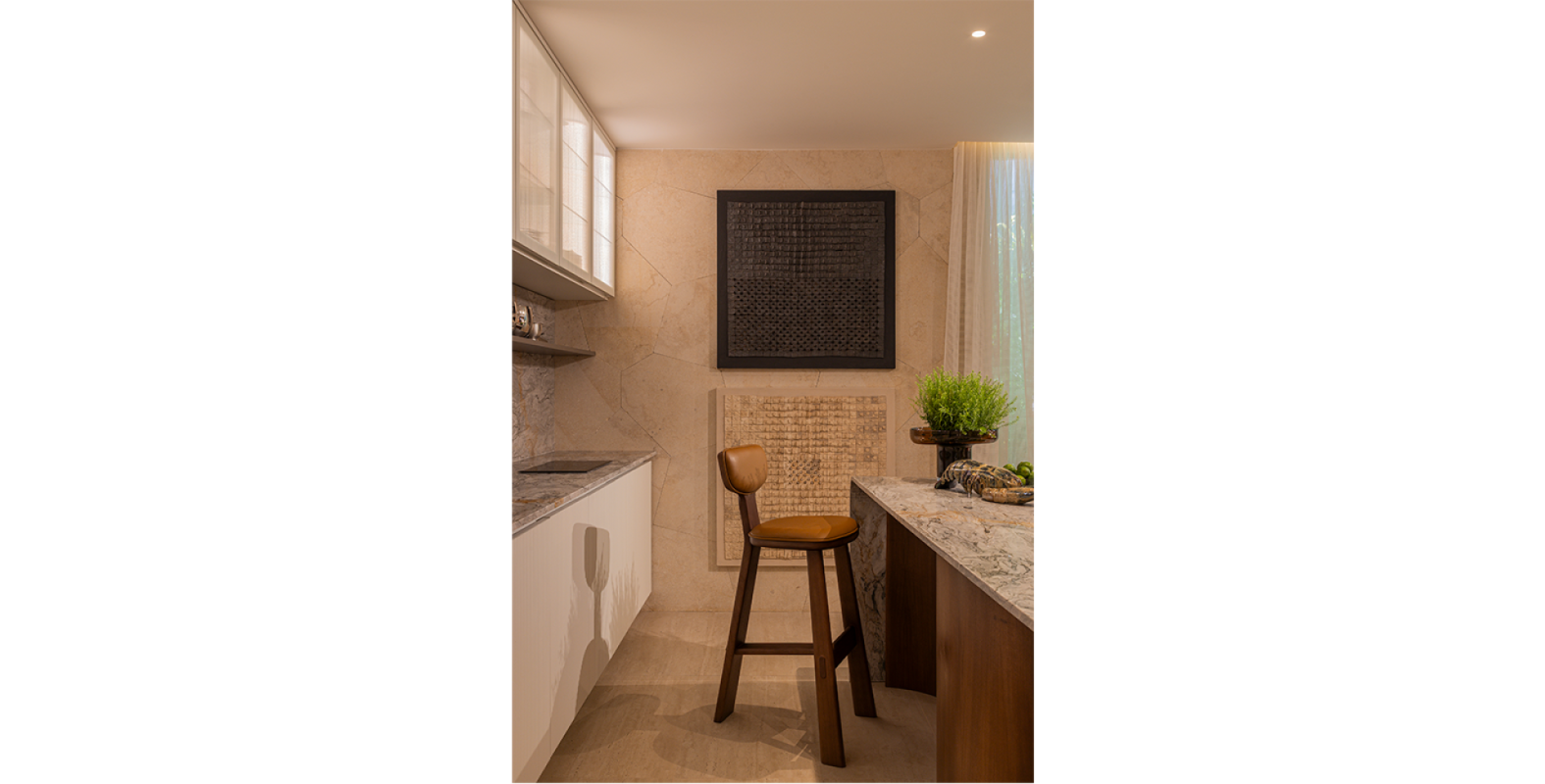 Ambientes banhados por iluminação natural fluem em harmonia, sustentados por uma base neutra de cores suaves e materiais nobres, que realça obras de arte piauiense e peças assinadas por grandes nomes do design nacional e internacional.