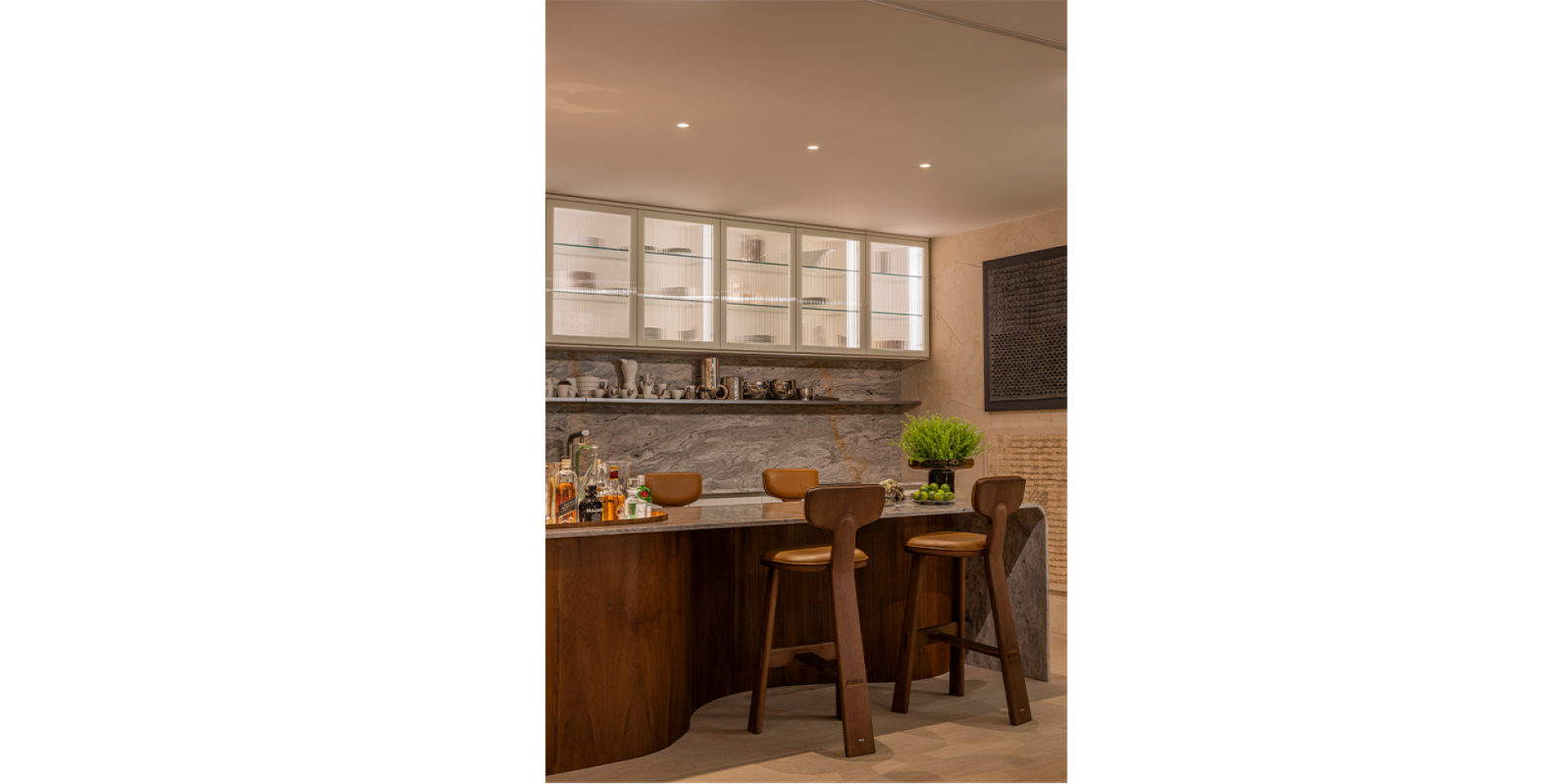 Entre os destaques, a Banqueta Estandarte, de Samuca Gerber, estabelece um diálogo equilibrado entre tradição e modernidade. Com estrutura precisa, uso refinado da madeira e assento acolhedor, a peça combina versatilidade e sofisticação funcional, reforçando a atmosfera leve e sofisticada que define este projeto.