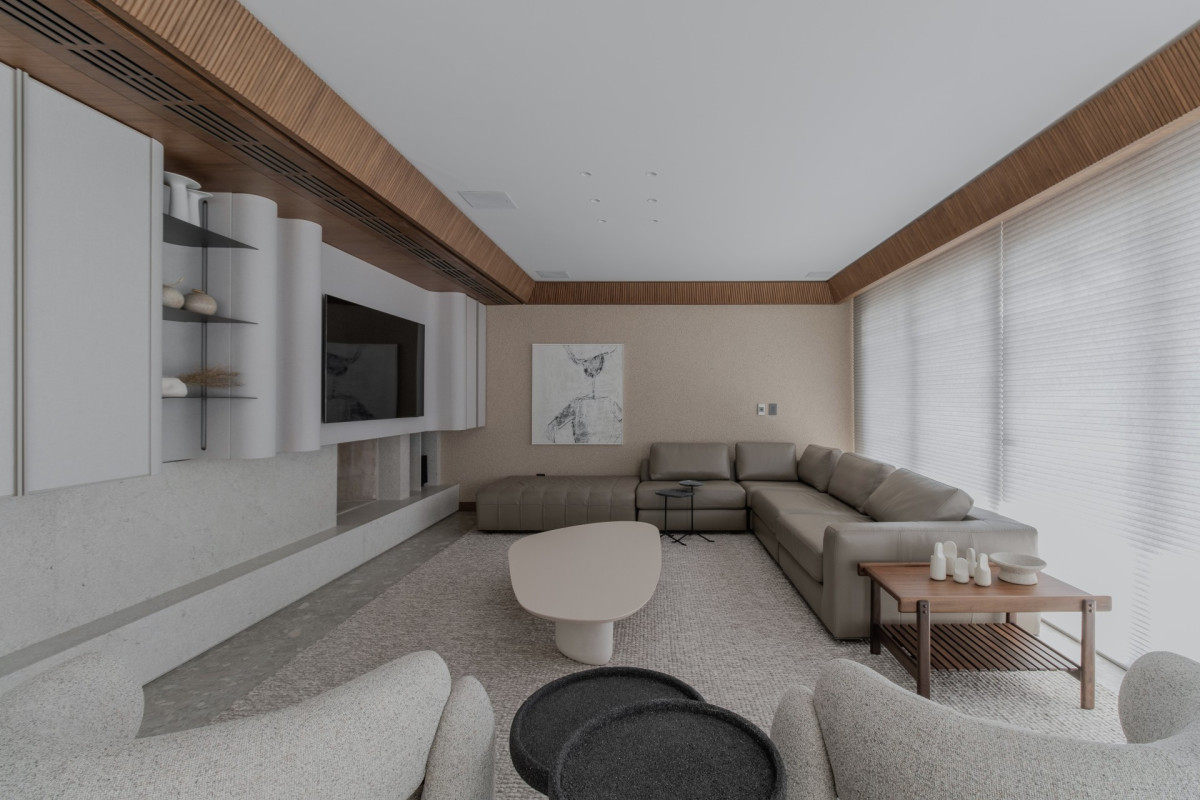 No home cine, o sofá Concept oferece um refúgio de conforto, envolvendo em tons leves e neutros que exploram texturas e formas com uma sofisticação serena.