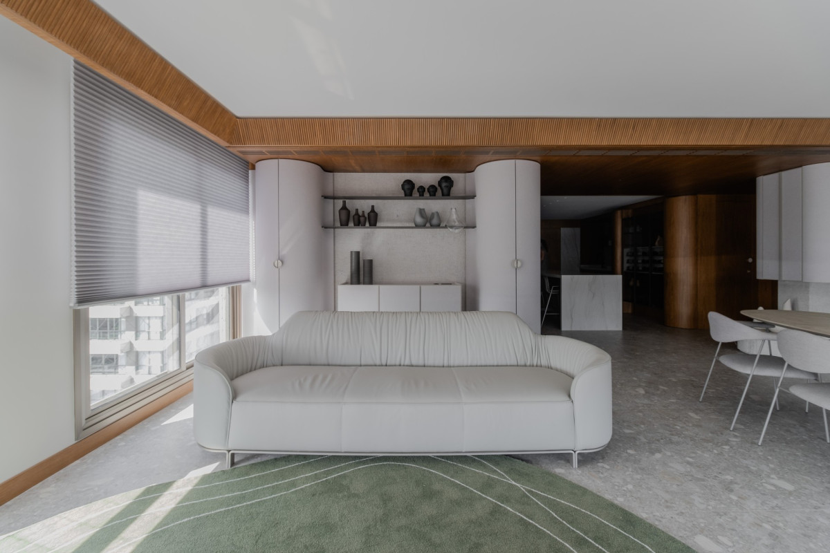 O destaque vai para o design marcante do sofá Linea, assinado pelo escritório, que confere personalidade única ao espaço.