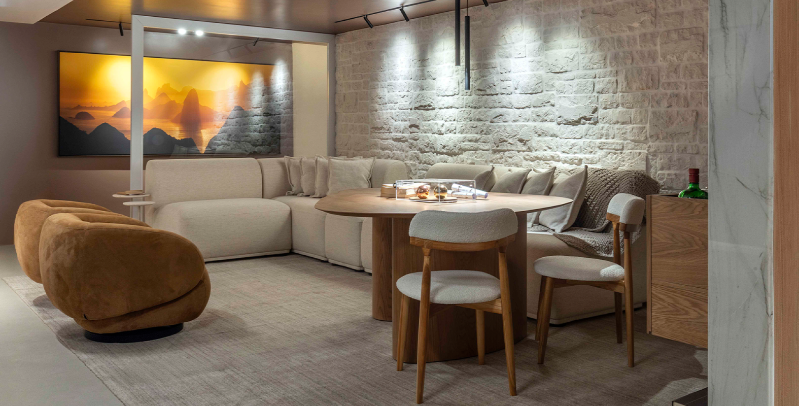 A proposta valoriza a funcionalidade aliada ao bem-estar, com elementos que adicionam textura e acolhimento ao espaço. O uso de mobiliário modular garante versatilidade, permitindo que a área de lounge se transforme em uma sala de estar e jantar. As obras do fotógrafo Celso Júnior complementam a ambientação, trazendo personalidade e sofisticação ao projeto.