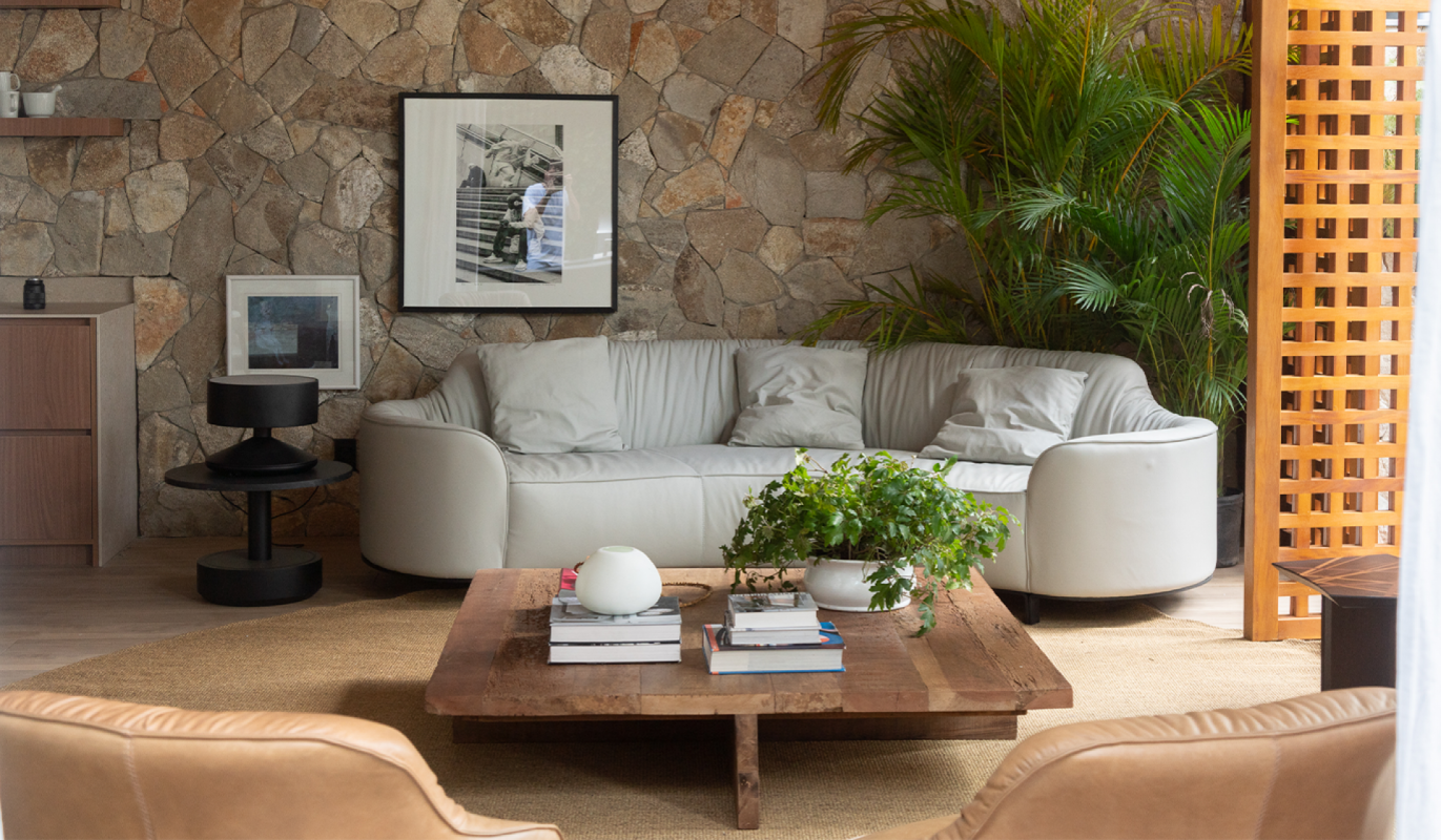 O ambiente incorpora peças de mobiliário da Salva, como o Sofá Veredas Curvo, as Poltronas Veredas Small e as Banquetas Seriemas, para criar um ambiente que integra elementos de design orgânico e funcionalidade.