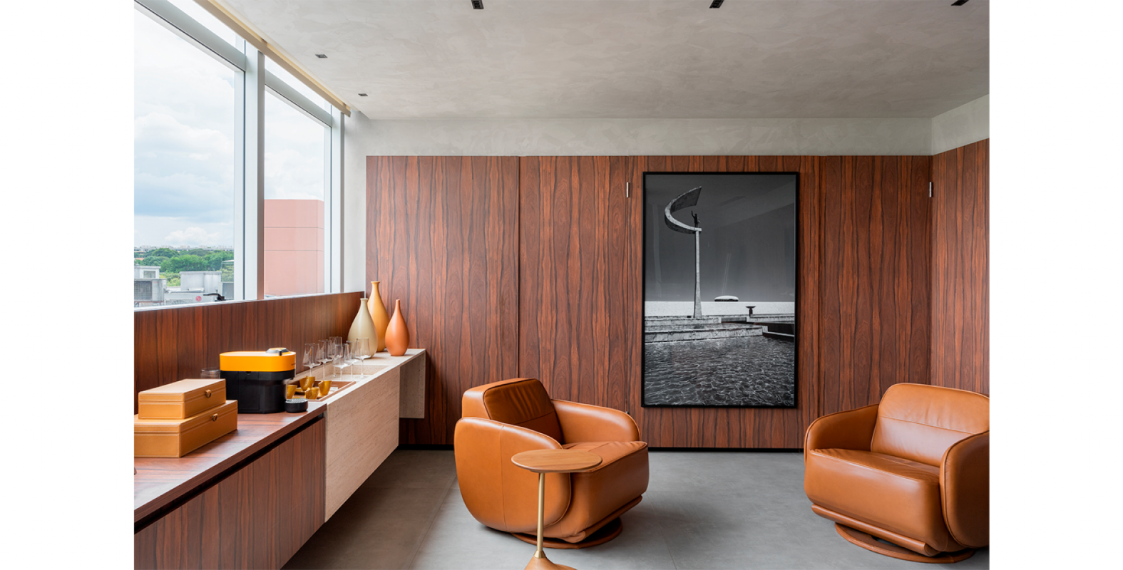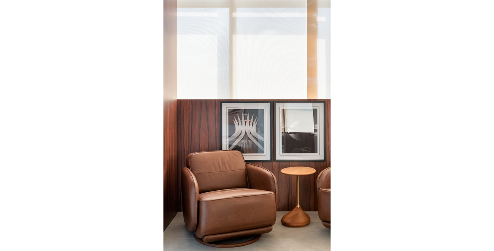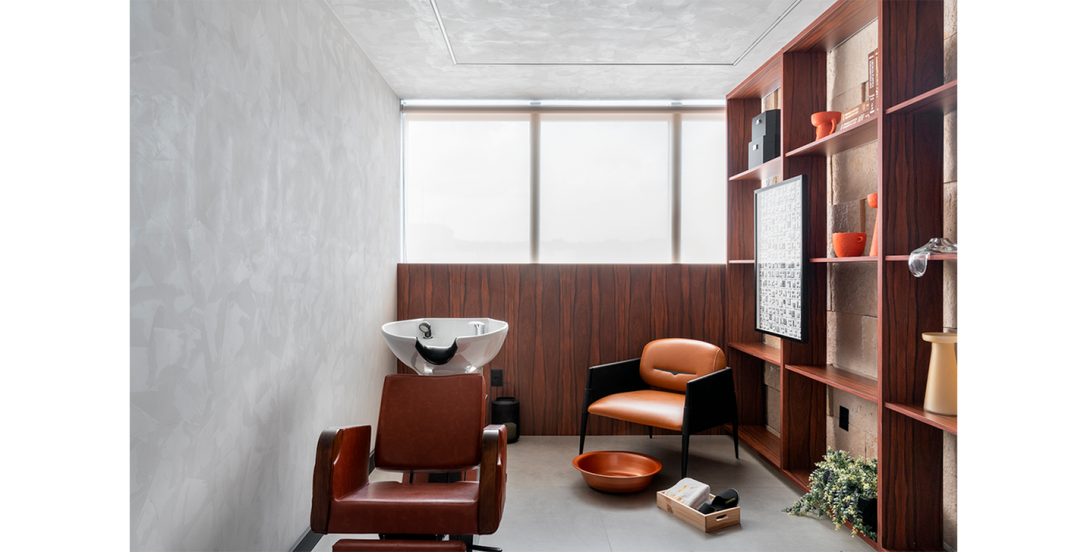 O protagonismo fica a cargo do pé de oliveira posicionada estrategicamente no jardim de inverno que traz a iluminação natural para o interior da clínica. Aliado ao uso da vegetação, a escolha das cores em tons terrosos e as linhas orgânicas dos mobiliários , remetem à natureza oferecendo uma sensação de fluidez e movimento , criando um ambiente acolhedor e convidativo.