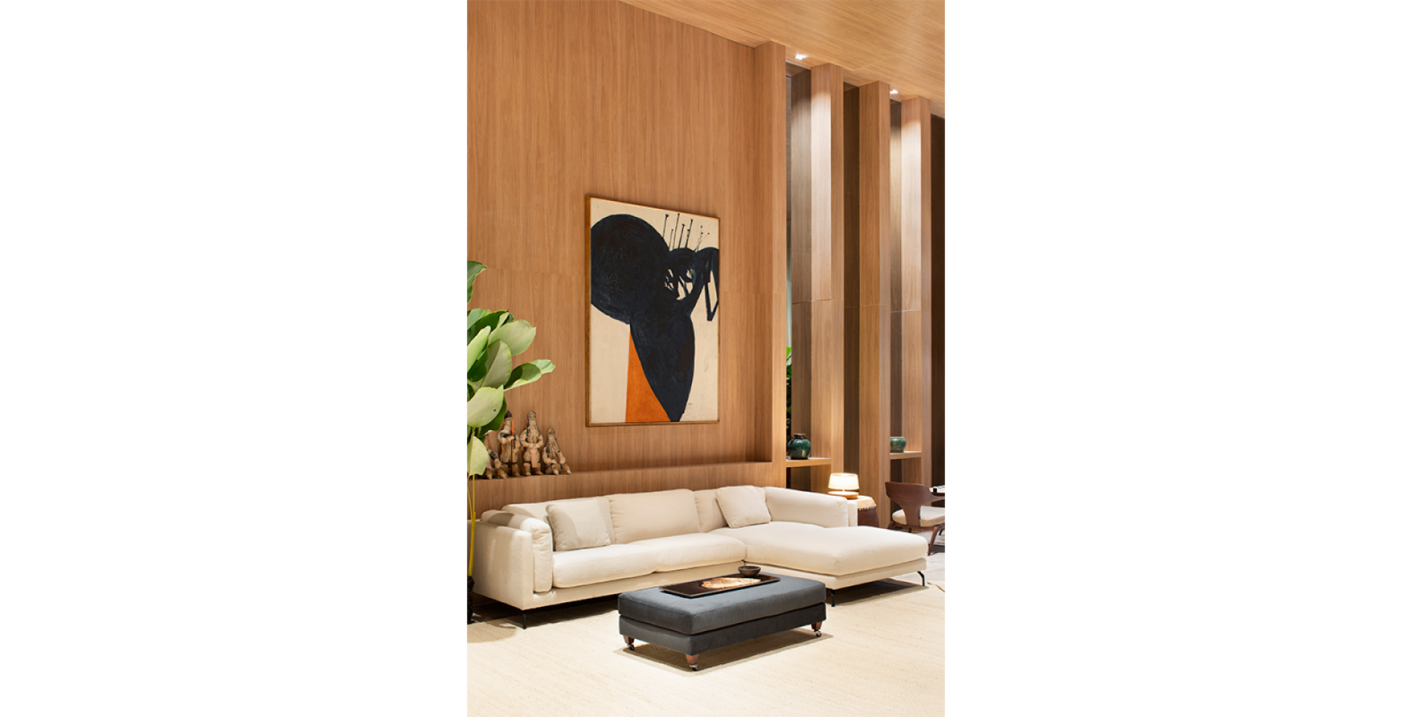 Obras de arte brasileiras, mobiliário garimpado e vegetação tropical compõem um espaço que acolhe as múltiplas funções da vida — do estar ao jantar, do trabalho à contemplação.