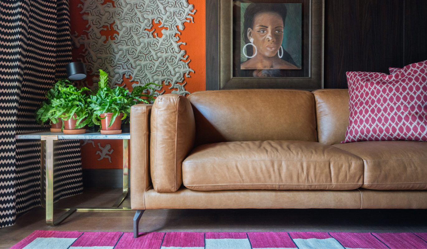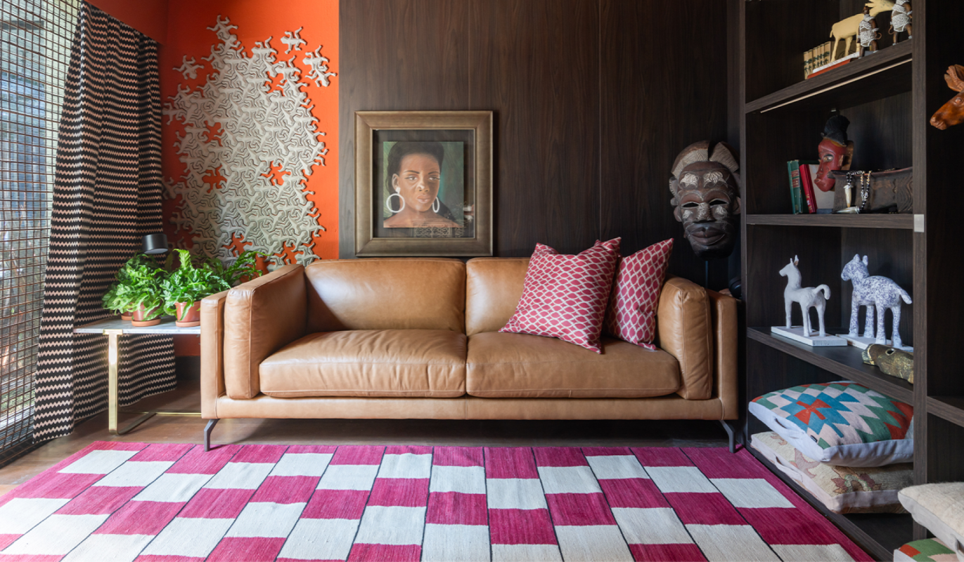 Os elementos singulares do espaço emolduram o sofá Fulton, revestido em couro La Paz Camel. Destaque no ambiente, o sofá contrasta com os tons amadeirados e vibrantes escolhidos pelo designer, promovendo uma atmosfera irreverente de aconchego.