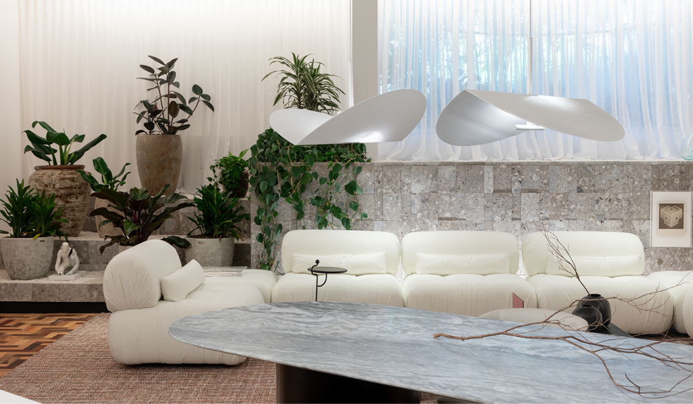 As formas arredondadas do sofá Igarapé destacam-se, harmonizando-se perfeitamente com a essência do ambiente sofisticado e acolhedor.