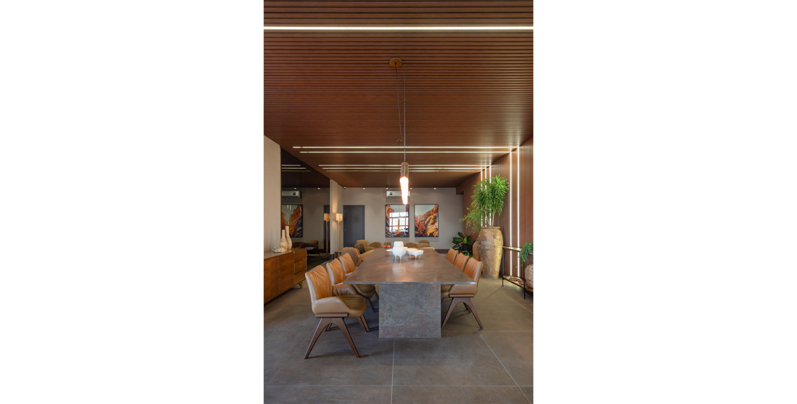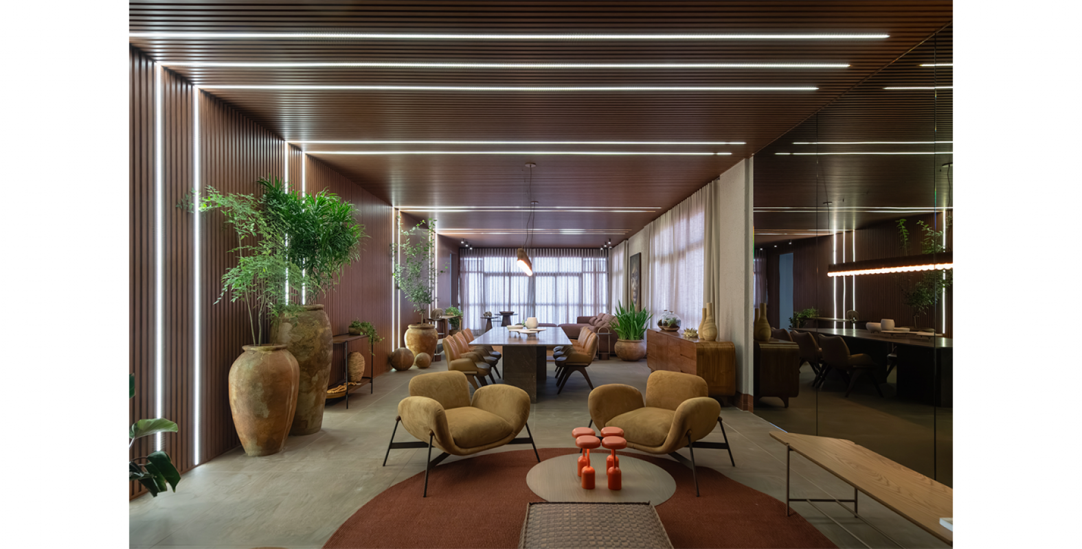 Assinado por Aclaene Mello, o ambiente propõe uma arquitetura consciente e afetiva, que valoriza a sustentabilidade, a inclusão e o Brasil como território criativo.